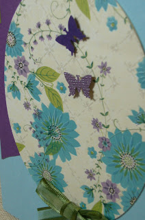 More bitty butterflies! Aren't they just the cutest? ; ) The focal point of this card is the beautiful dp oval. Yes, it was a scrap, already cut and waiting to be used. I know it doesn't show up in pics, but this paper is just gorgeous. It has it's own dimension and glimmer. All it needed were some, yes, butterflies. Don't you love the tiny bow? My sister tied it for me; my fingers aren't quite so nimble anymore.